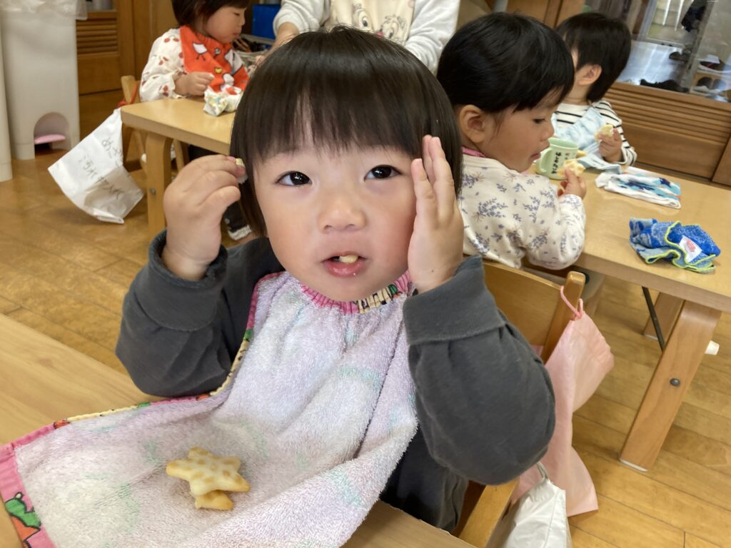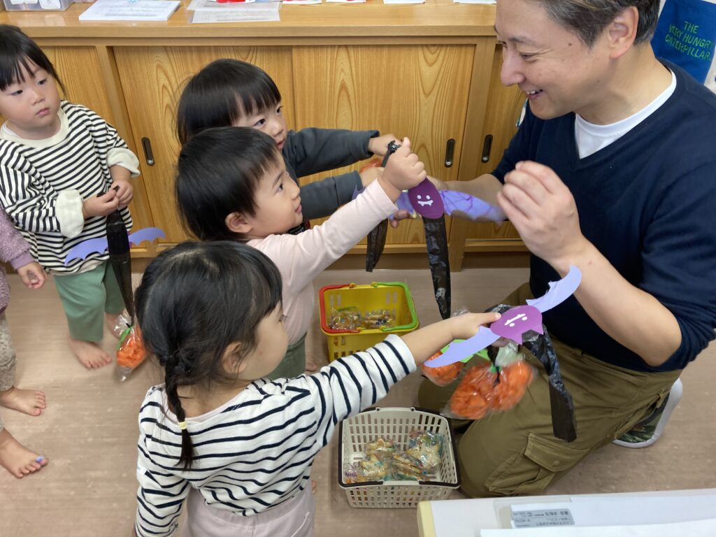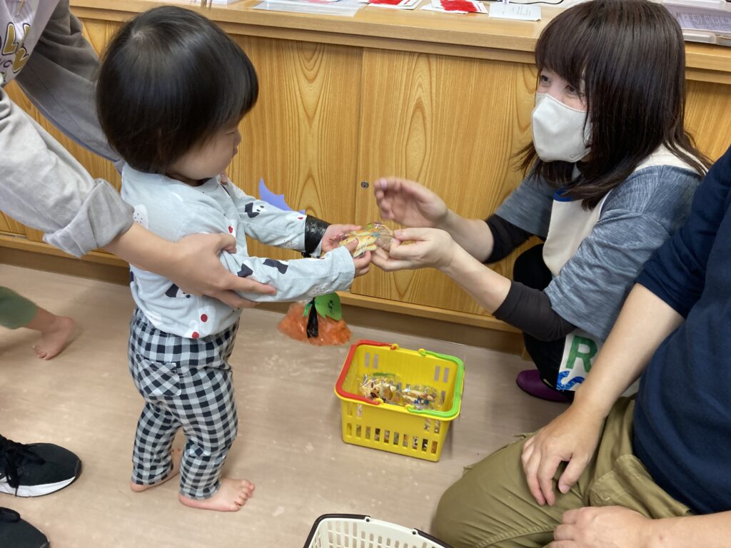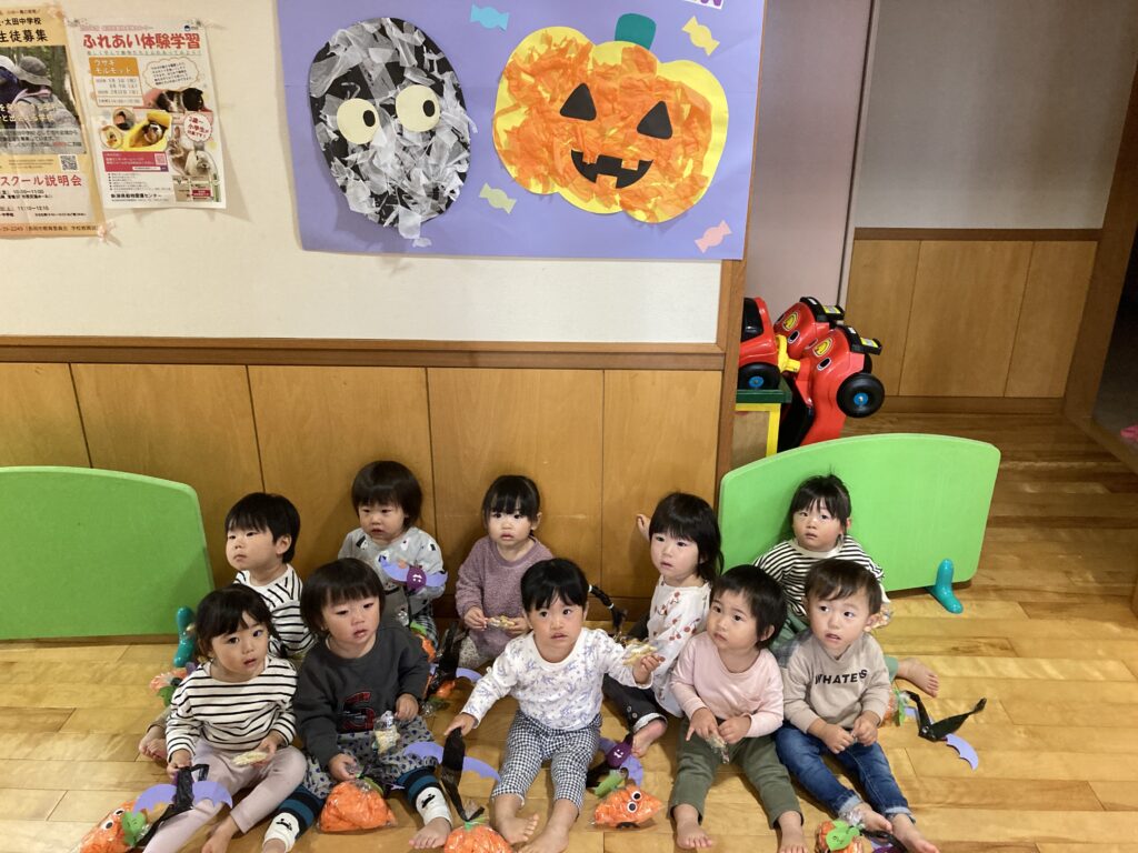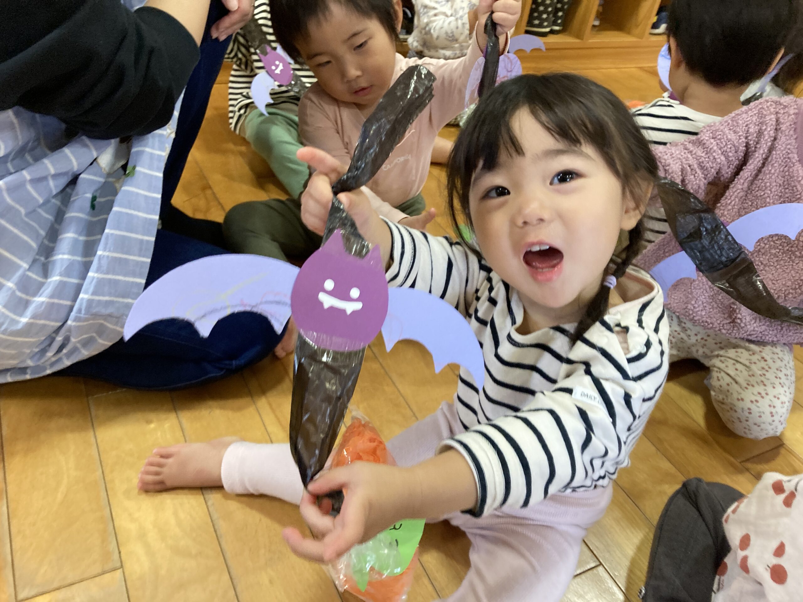 ハロウィンにちなんだ少しこわ~い絵本を見たり、お菓子をもらいに行ったりといつもと違った特別の1日。ちょっぴりドキドキ、でも笑顔いっぱいのハロウィンになりました☺