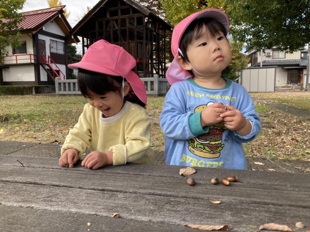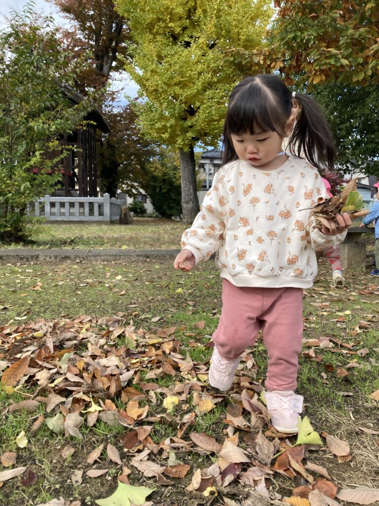 秋の公園にはどんぐりや赤や黄色の色とりどりの落ち葉がたくさん落ちていて、拾ったり並べてみたり葉を投げてみたりして自然物に触れあいながらのびのび遊びを楽しんでいました💛その様子をご覧ください!