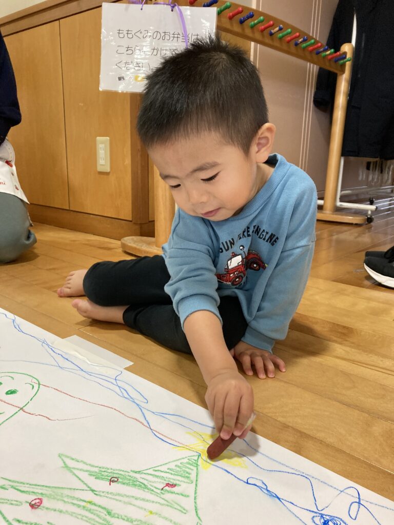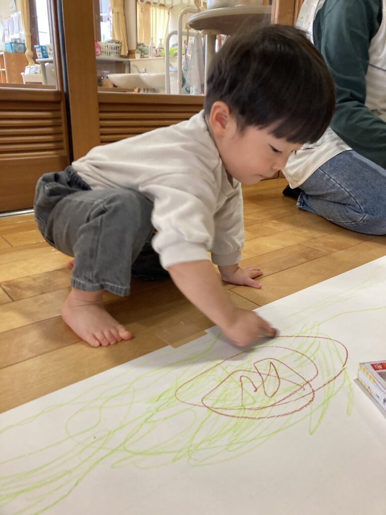 ぐるぐると丸を描いたり、線を描いたり・・・。一人ひとりが想像力を膨らませながら、のびのびと描いています!
