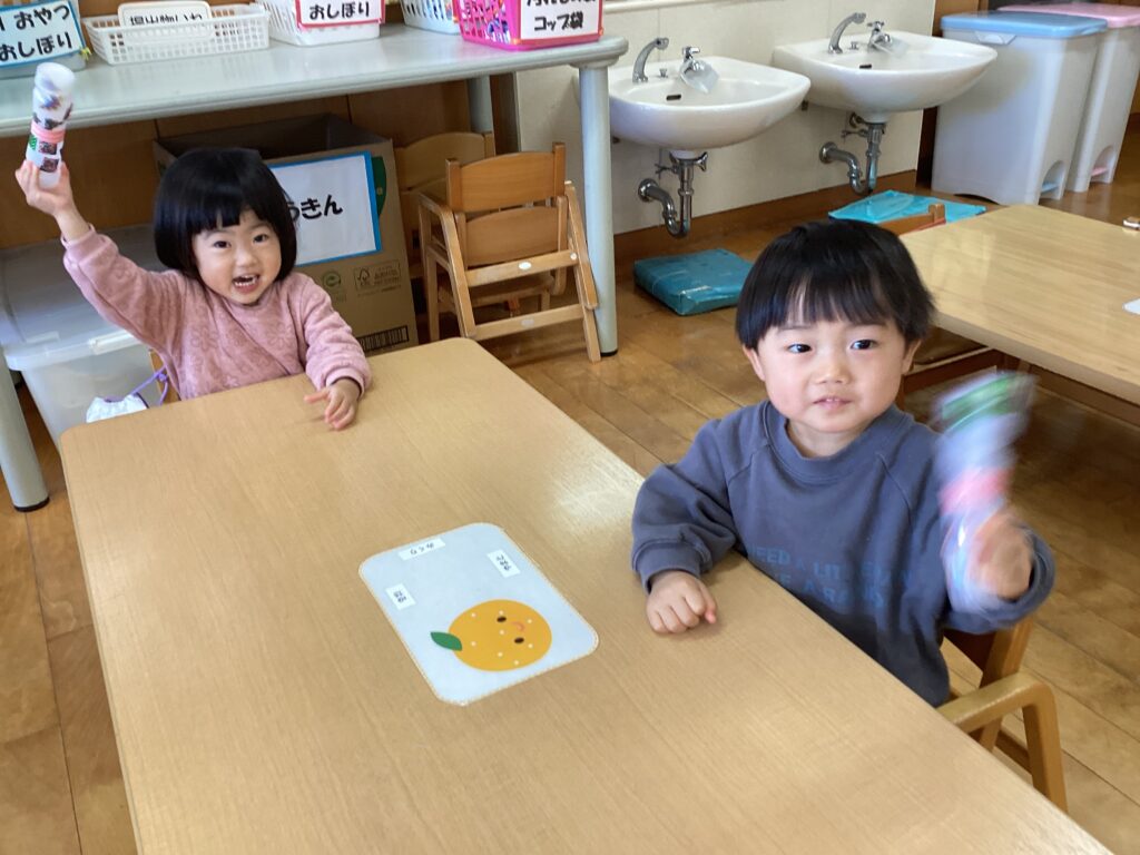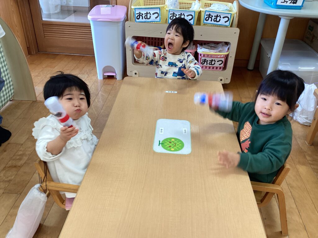 秋に採ったどんぐりを使って、マラカスづくりをしました。シールを自分で貼ってオリジナルのマラカスを作りました!指先も器用になり集中してシールを貼っていましたよ☆最後はみんなで音楽に合わせてシャカシャカと振って合奏を楽しみました♪
