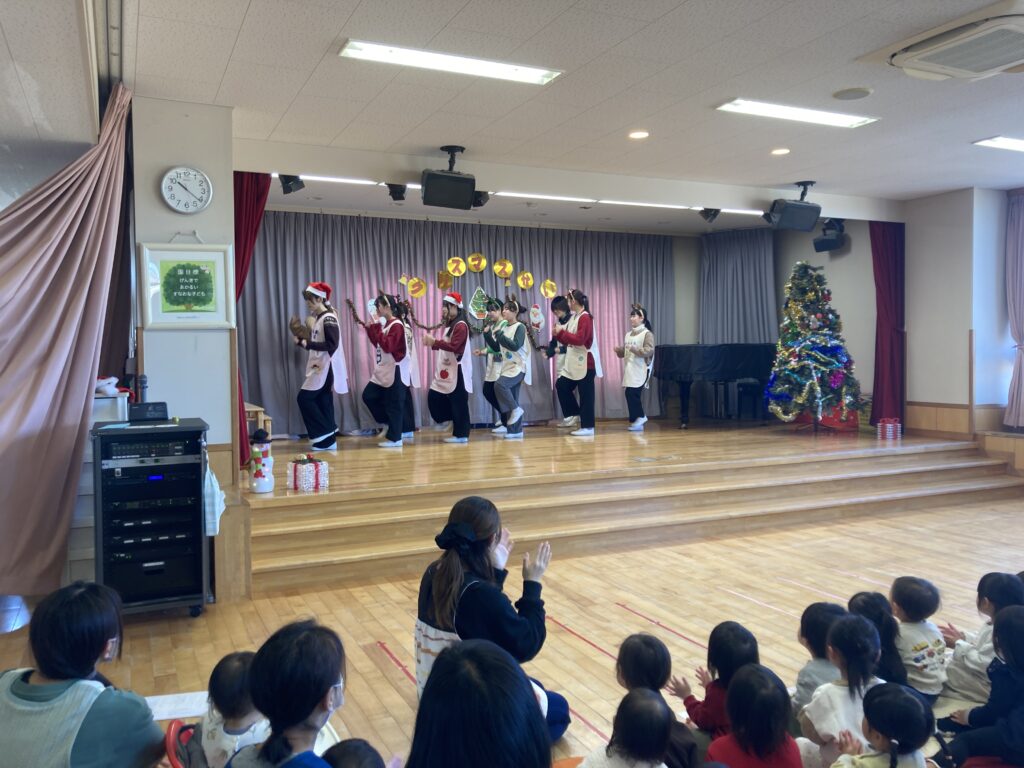 ダンスやハンドベルなどを披露してくださり、子ども達も目をキラキラさせ、手拍子をしたり学生さんに手を振ったりと、とても楽しそうな姿が!