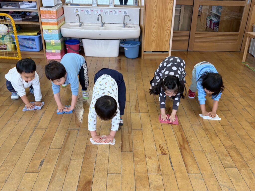 最後にはぞうきんがけ競争!手と足に力をいれて頑張ってくれました!