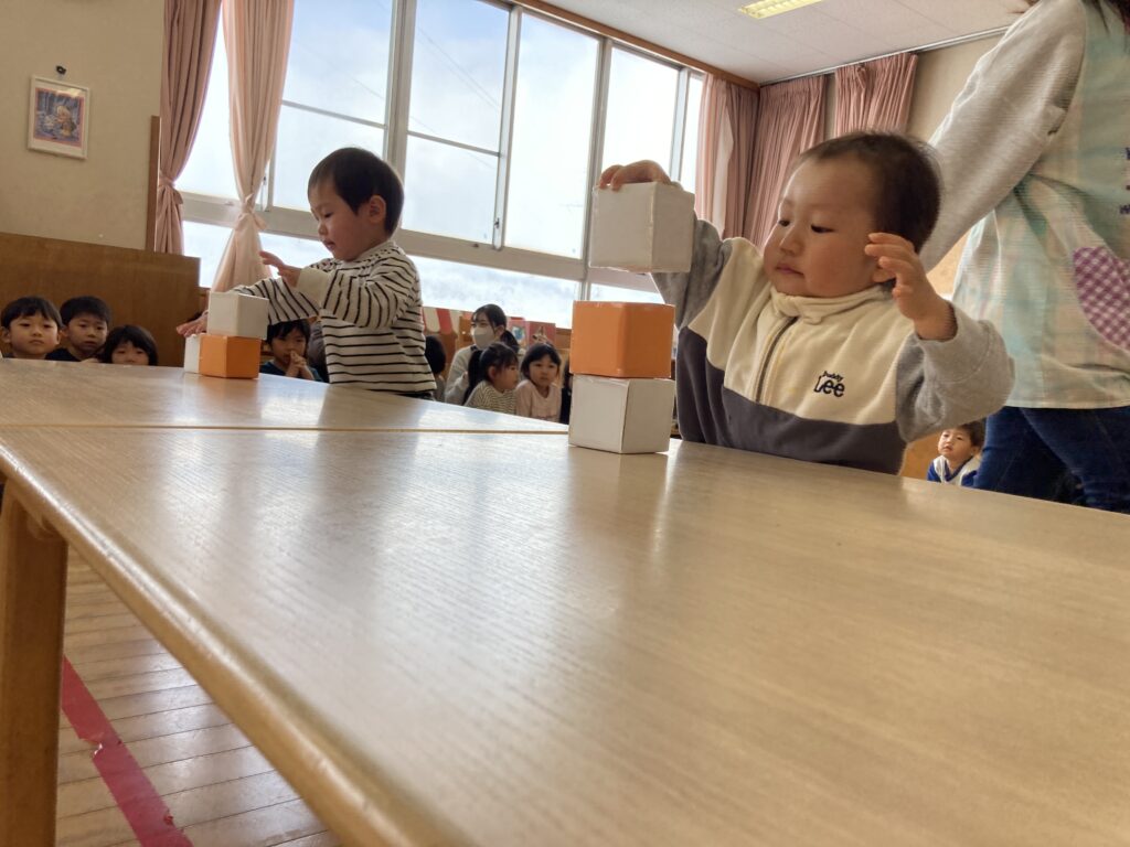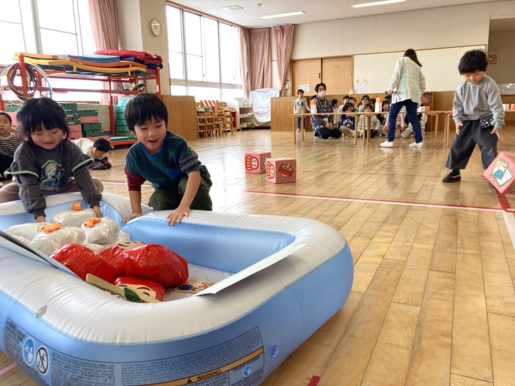 お楽しみゲームでは、正方形を餅に見立て鏡餅を作り、さいころを転がして当たったアイテムを見つけてゴール!とっても楽しそうな様子でしたよ!