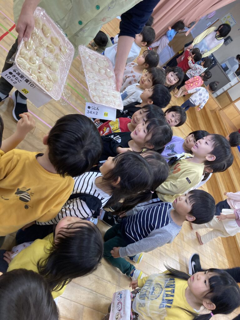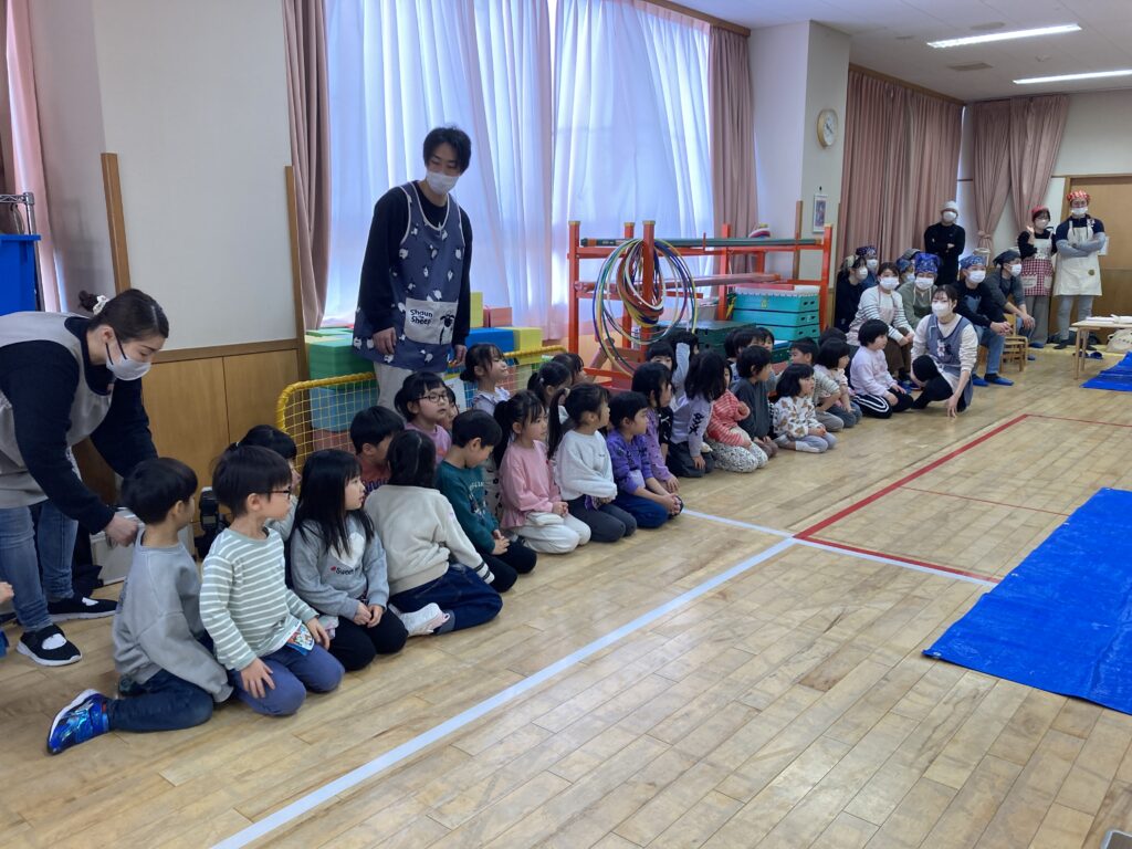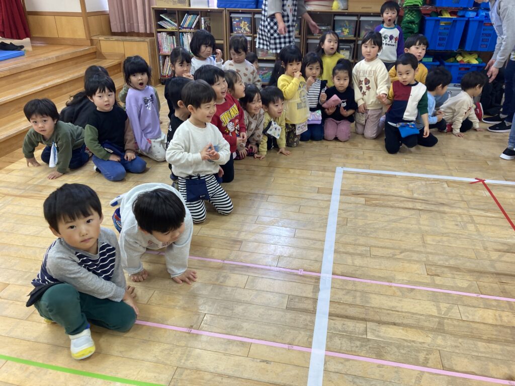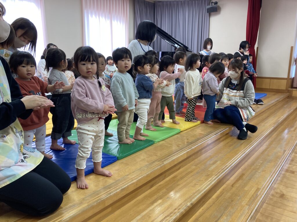 遊戯室にはすずらん組からひまわり組までいなばこども園のお友だちが全員揃っての参加でした😊