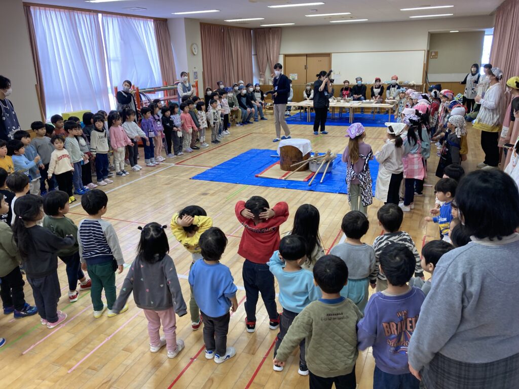 みんなの「よいしょ!よいしょ!」の掛け声に合わせて、重たいきねを元気に動かし、立派な鏡餅ができました🍊立派な鏡餅はいなばこども園の玄関先に飾られています。ぜひ、ご覧ください♪
